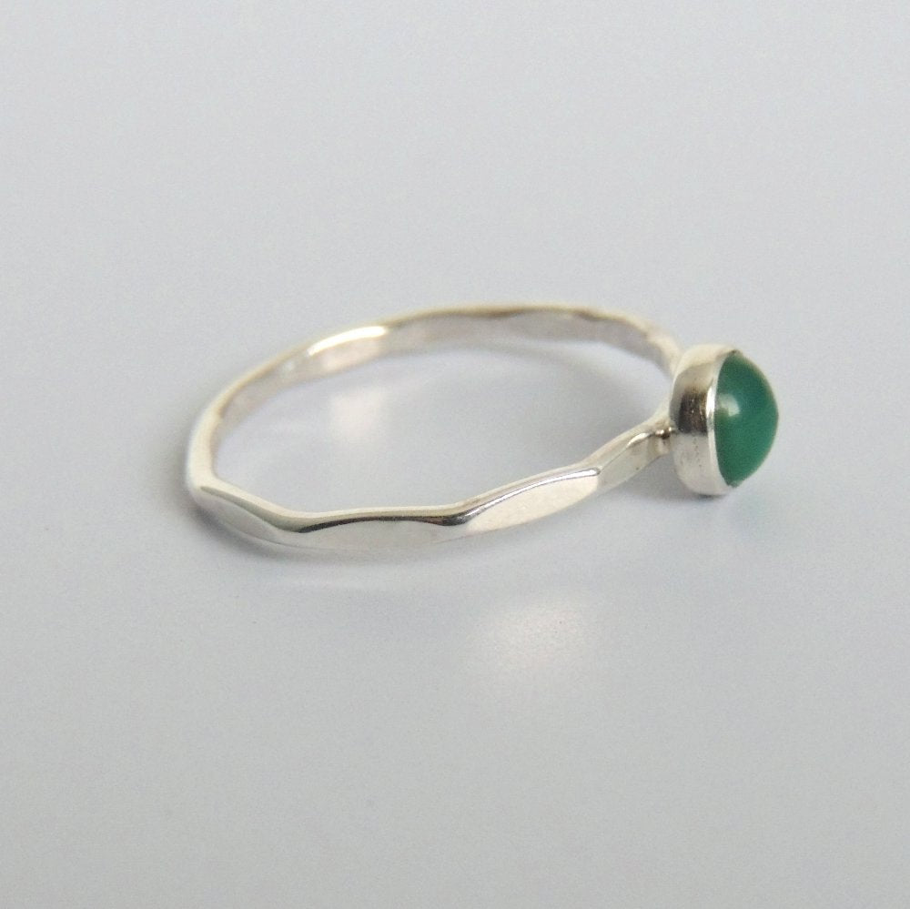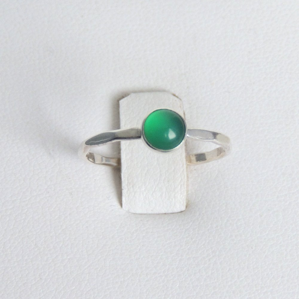 This beautiful 5mm green onyx cabochon has been bezel set in a handmade ring of sterling silver. The band is a slim band of sterling silver that I have given a shiny, faceted finish. It sparkles and catches the light beautifully.